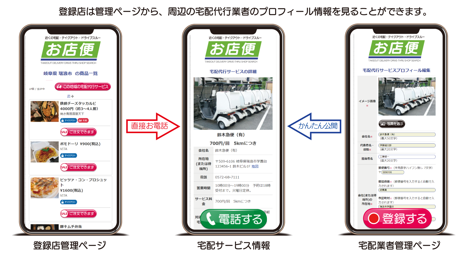 お店便の新機能として、宅配代行業者が配達地域や料金設定などの情報を無料で登録でき、登録店からは周辺の宅配代行業者情報が簡単に閲覧できるマッチング機能を追加しました。依頼・問い合わせは直接電話でのやり取りとなります。